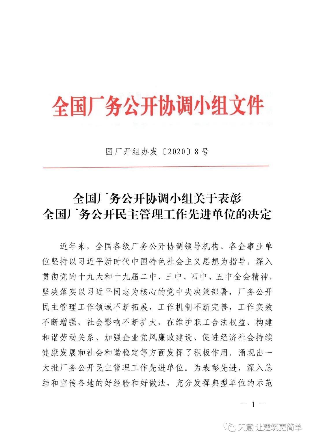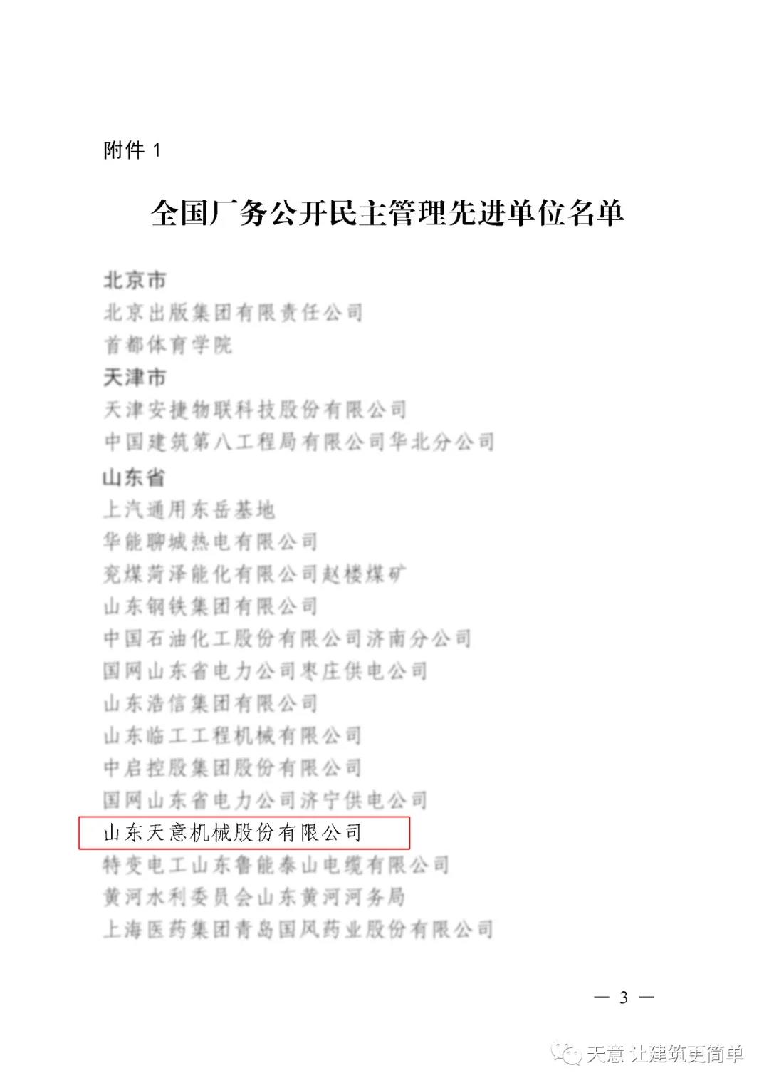 喜訊丨祝賀天意機(jī)械被授予“全國(guó)廠務(wù)公開(kāi)民主管理先進(jìn)單位”稱號(hào)