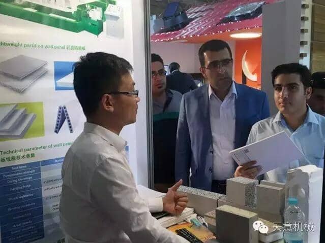 展會上,天意機械銷售經理劉春剛細心的向前來咨詢的客戶,介紹了天意綠色建筑建材裝備在建筑行業內的應用優勢,通過觀看產品應用視頻以及展現成品樣塊,使得天意展位前門庭若市。期間,外貿部銷售經理劉春剛,專程拜訪了天意公司在伊朗年產50萬平方的輕質墻板生產線合作伙伴。詳細了解客戶的生產情況,幫助客戶免費升級技術配方降低成本。