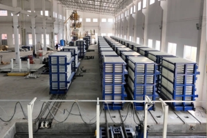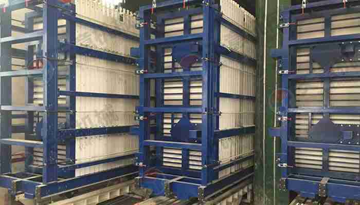 該復合墻板生產線立式旋轉臥式出板復合墻板成型機,一次可生產四十塊墻板,該生產線主要分為:配料攪拌系統、墻板成型系統、液壓整體開模系統、液壓翻轉系統、整體出板翻轉碼垛系統、成型機自動循環系統、變頻擺渡系統、數控配電系統等部件 組成。該生產線自動化程度高,液壓開合模,解決了傳統立式復合墻板機人工開合安全隱患,提高了工作效率。設備配有整體出板碼垛系統,解決了傳統人工出板方式,減少產品的破損率,提高了產能。生產線使用密封式泵送系統配備雙工位注漿槍,注漿速度快密實度高,材料粘結更緊密。