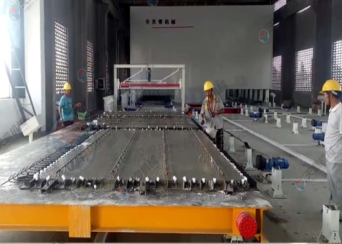 PC環形疊合板/內墻板生產線的主要設備包括雙梁橋式起重機、清理機、脫模劑噴涂機、布料機、振動臺、趕平機、拉毛裝置、預養窯、抹光機、碼垛車、養護窯、翻轉機、擺渡車、支撐滾輪、驅動輪、模臺和成品運輸車等。