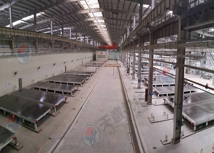 該生產線采用移動模臺加中央擺渡車的形式來生產構件,比起固定模臺來更加靈活,效率更高,澆筑振搗完的的構件由中央擺渡車將模臺送入養護窯養護,布局合理,工藝先進,可同時生產多種混凝土預制構件。