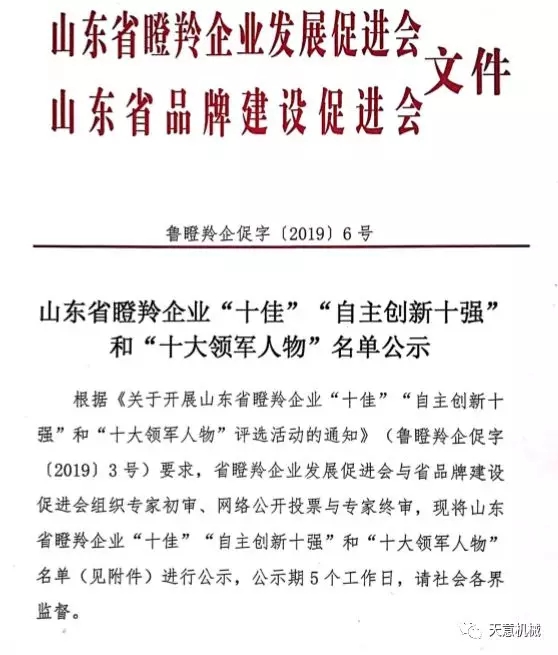 根據(jù)《關于開展山東省瞪羚企業(yè)十佳”“自主創(chuàng)新十強十大領軍人物評選活動的通知》(魯?shù)闪缙蟠僮帧?/span>20193號)要求,2019126日,山東省瞪羚企業(yè)發(fā)展促進會、山東省品牌建設促進會發(fā)布魯?shù)闪缙蟠僮?/span>[2019]6號文,公布經(jīng)過專家初審、網(wǎng)絡公開投票與專家終審,評選出了山東省瞪羚企業(yè)十佳自主創(chuàng)新十強十大領軍人物。天意機械榮獲“山東省十佳瞪羚企業(yè)”稱號。