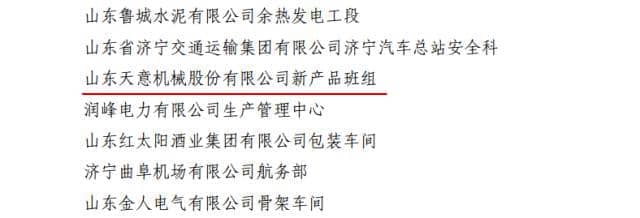重磅消息:天意機械新產品班組榮獲“山東省青年安全生產示范崗”榮譽稱號